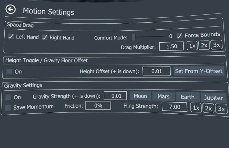 Fling Strength: Adjust to control how far/fast you move when “throwing” the controller.