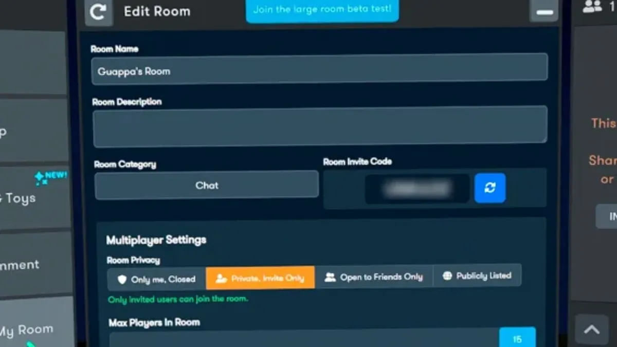 - Room Type: Choose between a variety of settings to open or limit who can join your room (E.g. Invite only, Friends only or open for everyone)