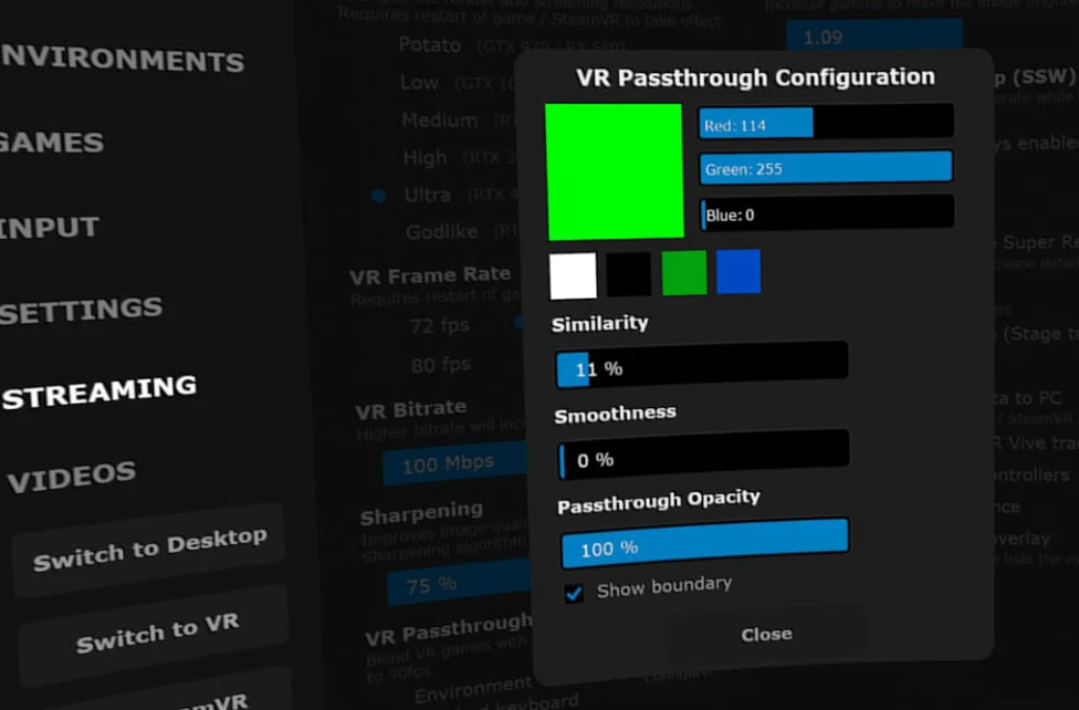 If you want to use the green paint in Bigscreen to utilize passthrough, check the image below for the values under 'Streaming'. Also check the environment checkbox under VR Passthrough.