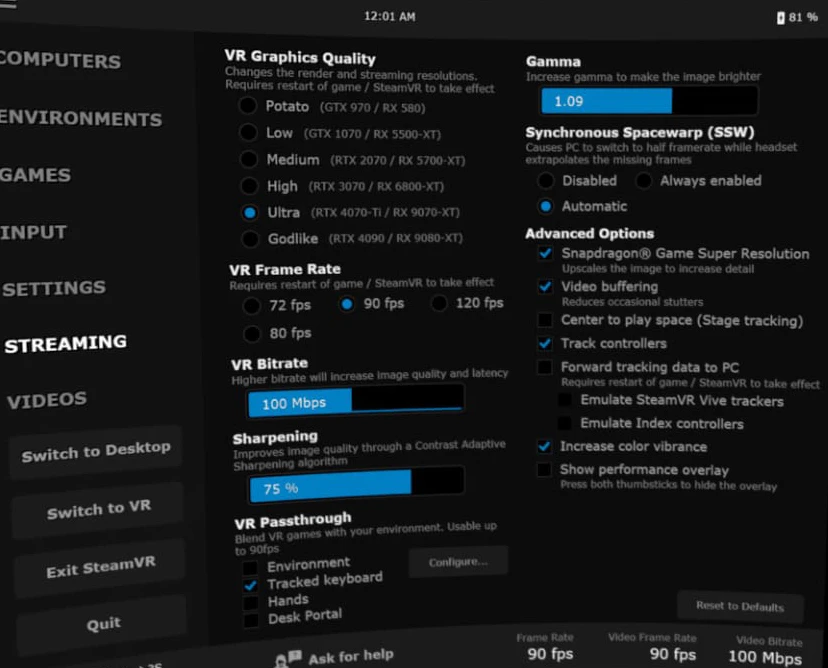 - PCVR Gaming: From the VR menu’s Games tab, select and launch SteamVR or Oculus titles directly (SteamVR installs automatically on first use). Prefer VDXR runtime for best compatibility.