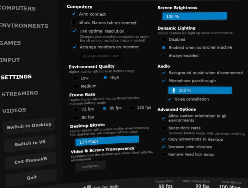 Options include: Adjust screen size/curvature, launch SteamVR/Oculus games (from Games tab), play media, or tweak streaming quality (e.g., bitrate up to 200 Mbps for high-end setups).